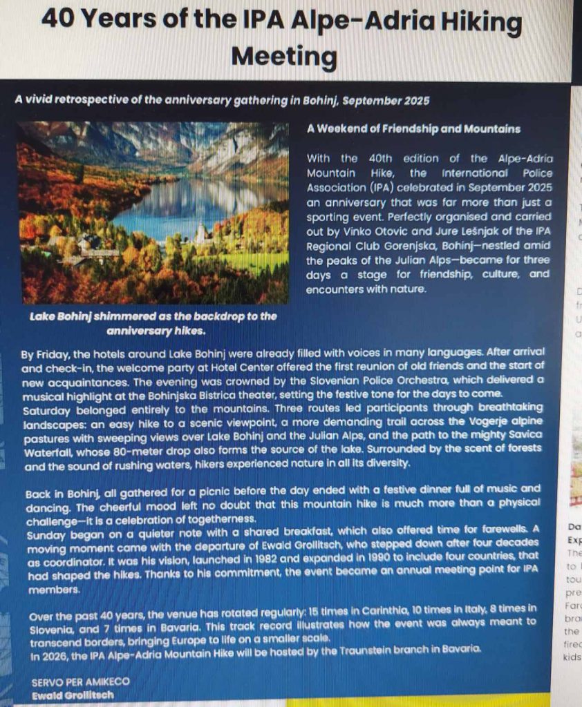 Praznovanje letošnje jubilejne 40. izvedbe planinskih dnevov je minilo v izredno lepem okolju v Bohinju in ob res prisrčnem druženju. Da so bili tudi gostje zadovoljni preberemo iz Mednarodnih IPA novic, kjer je začetnik IPA planinskih dnevov častni predsednik IPA Koroške Ewald Grollitsch opisal, kako je minilo praznovanje 40 let planinskih IPA dnevov.